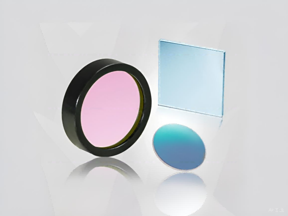 有色玻璃滤光片是指在玻璃熔炼过程中添加特种元素,从而对不同的光谱波段产生吸收,并对其他波段光谱透过。不同于介质镀膜滤光片,有色玻璃滤光片对不同入射角入射的光束,其中心波长不会变动。
